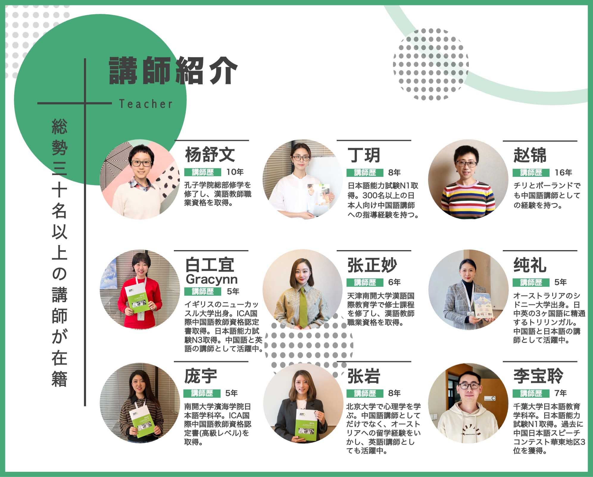 総勢30名を超える厳選した経験豊富な講師陣が在籍しております。全員が国際漢語教師職業資格取得の講師。質の高い、プロフェッショナルな授業を提供できるよう、定期的に学内にて教育・研修も行っており、常にスキル向上に努めています。