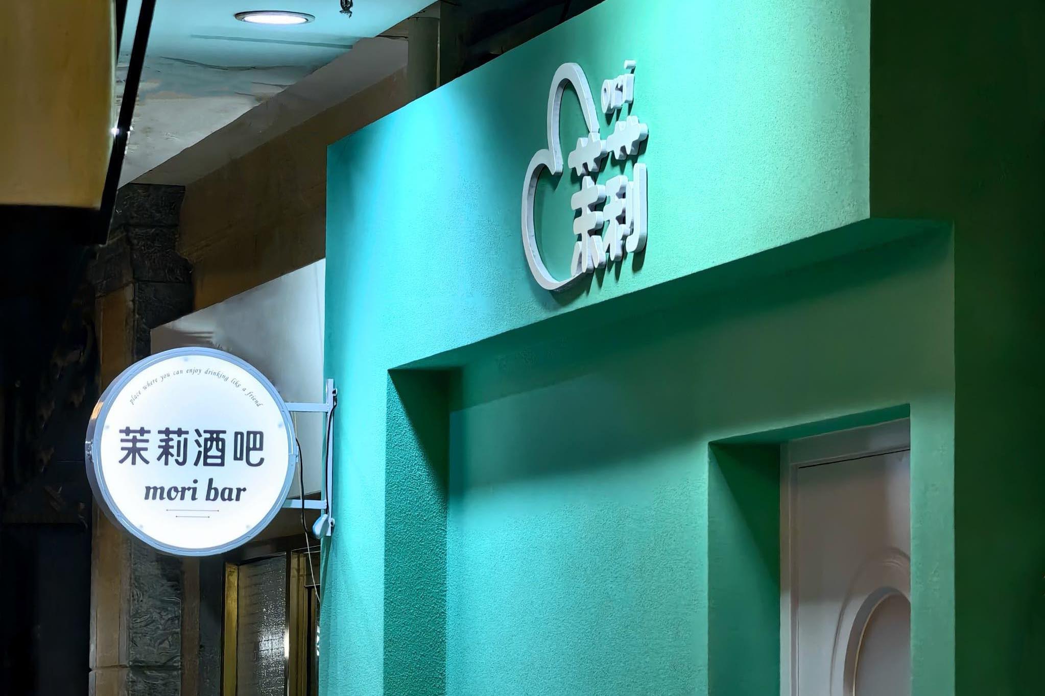 誠基中心2階にある「Mori (モーリー) bar」。ターコイズブルーに白いドアが目印です。