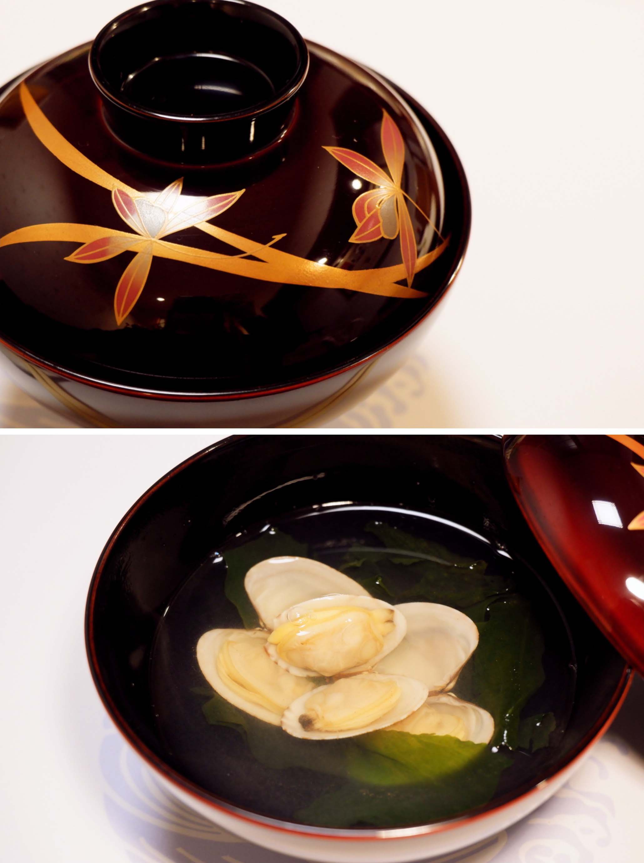 こちらのお吸い物に使われているのが越前塗の「御吸物椀」。日本から取り寄せたもので、この漆器がお料理に味わいをプラス。コースの随所で店主の食器へのこだわりを感じ、お料理に彩りを加えてくれています。