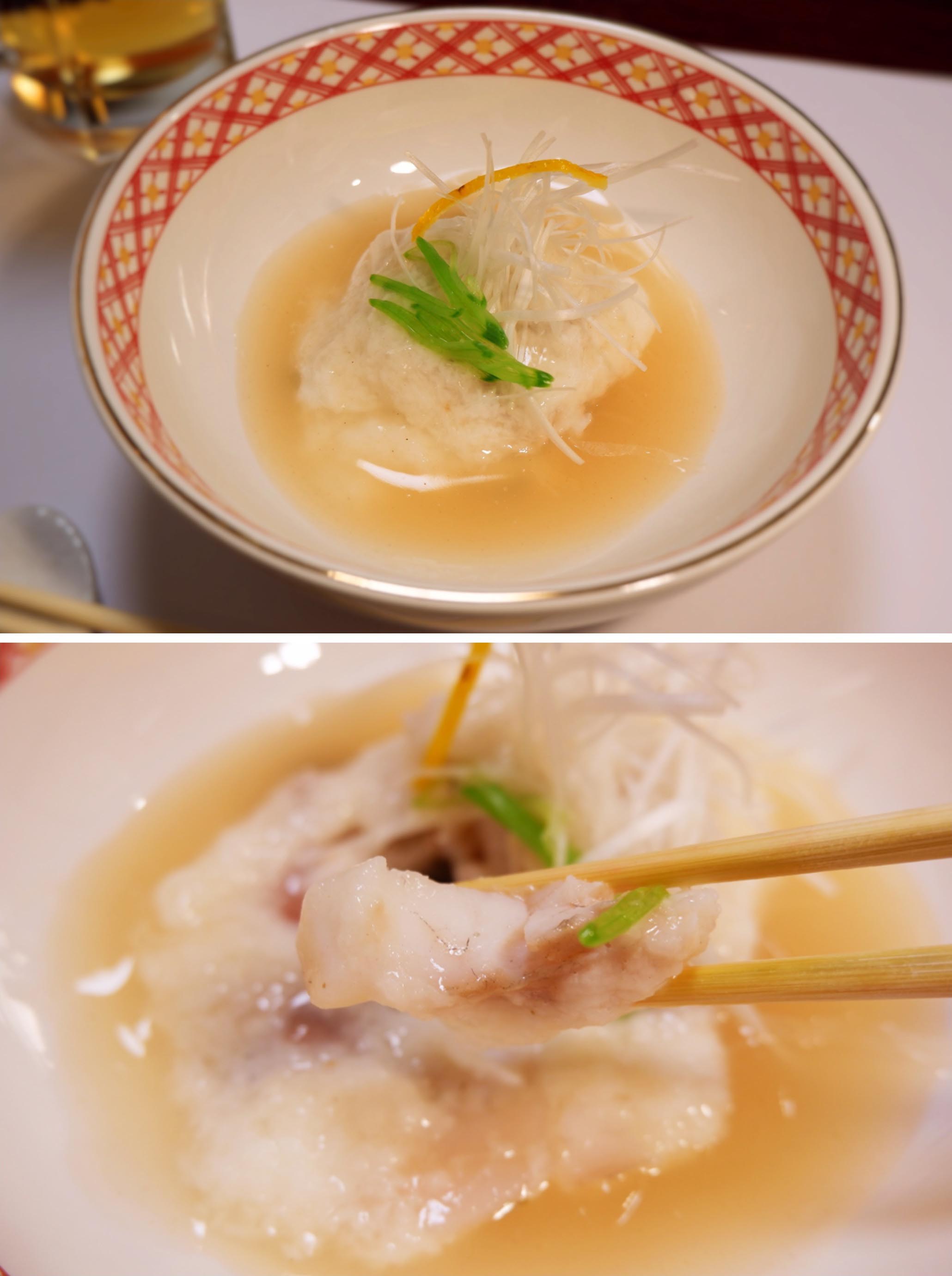 上に乗っているのはゆずの皮と白髪ねぎ、そして絹さや。下は、とろろとあんの「Wとろとろ」が鯛の身を優しく包み込み、一番下には昆布が敷いてあります。身体が「どんどん吸収して〜」と言わんばかりの優しい味です。鯛もふわふわで昆布やあんも残さず全部いただきました!