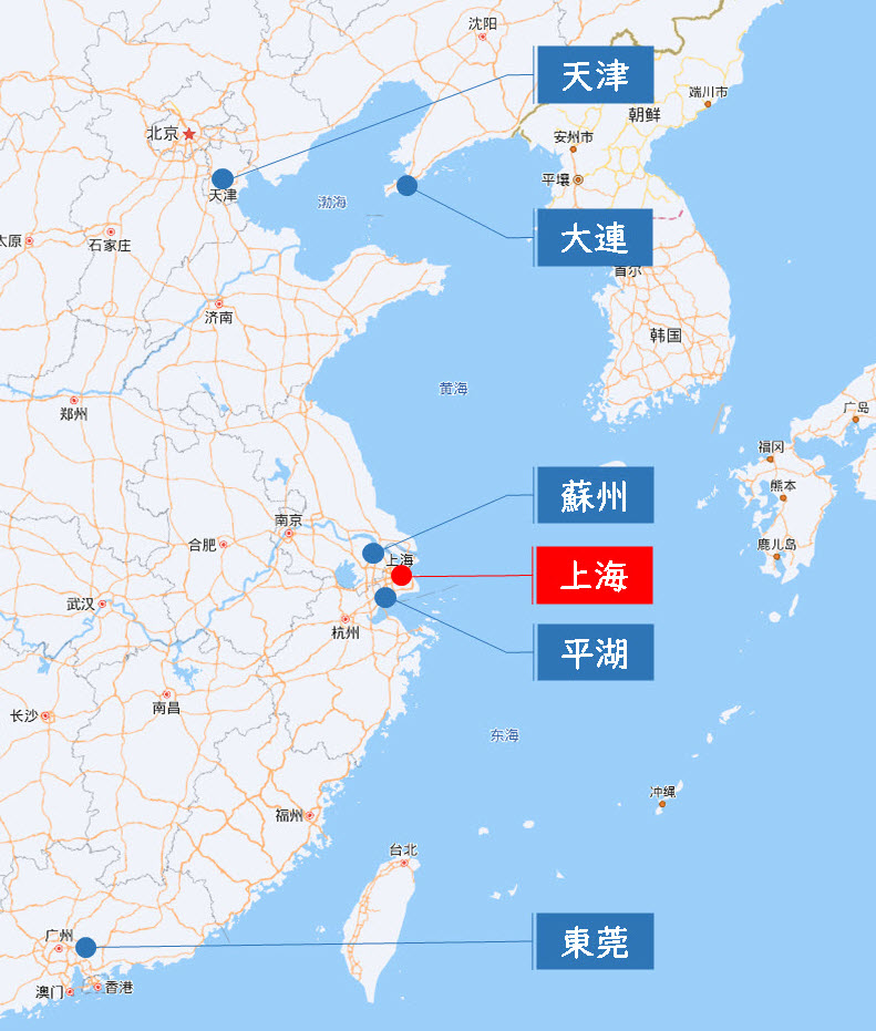 日伝は2003年に中国に進出し設立したのが、日伝国際貿易(上海)有限公司です。現在中国では6つの拠点及び物流センター兼LMガイド加工センター(平湖)を有します。
