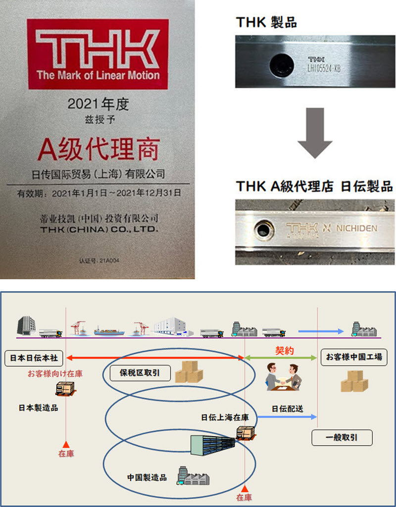 私たちはメーカーの代理店として中国の現地製造に貢献し、中国に進出したメーカーの販売拡大に注力しています。 また、私たちは日本でも多くのメーカーの代理店として登録されており、それらメーカーの製品を日本から輸入する際に全面的なサポートを提供することができます。 2019年日伝は日系企業としてTHKの唯一のA級代理店となりました。 A級代理店はTHKと同様にカット品にロゴ(右図)を付けます。THKまたはA級代理店のロゴが無い場合は模倣品としてTHKは一切の品質保証を行いません。