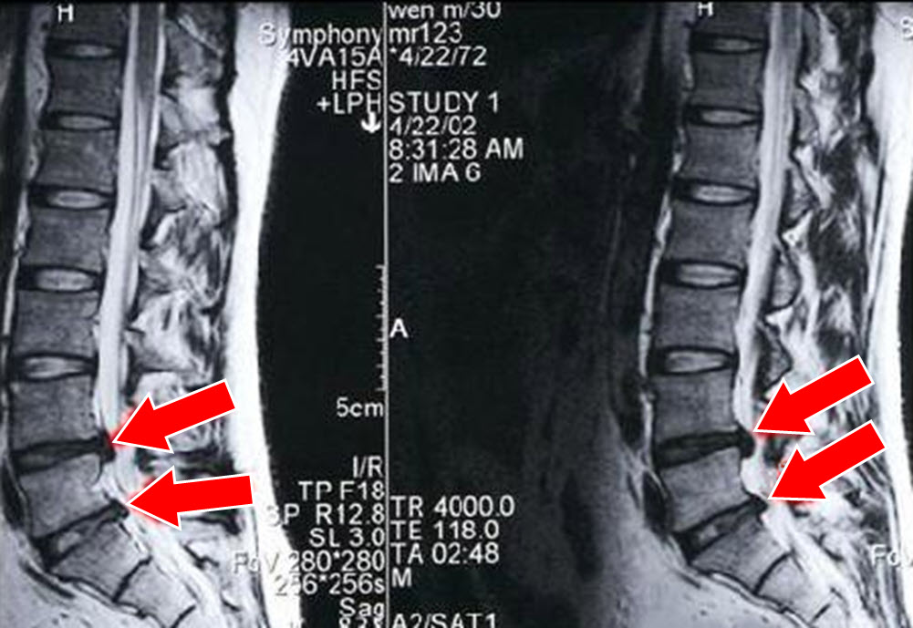 慢性腰痛の原因は、腰部の筋肉が硬直し、腰椎の間隔が狭くなり、その間にあるクッションの椎間板が押し出され(上図矢印の部分)、神経を圧迫することで、足が痺れ、足の感覚異常が出てくるのです。