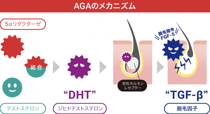 AGA発症のきっかけは、男性ホルモンの一種「テストステロン」と「5αリダクターゼ」と呼ばれる酵素の結合による「DHT(ジヒドロテストステロン)」の発生です。