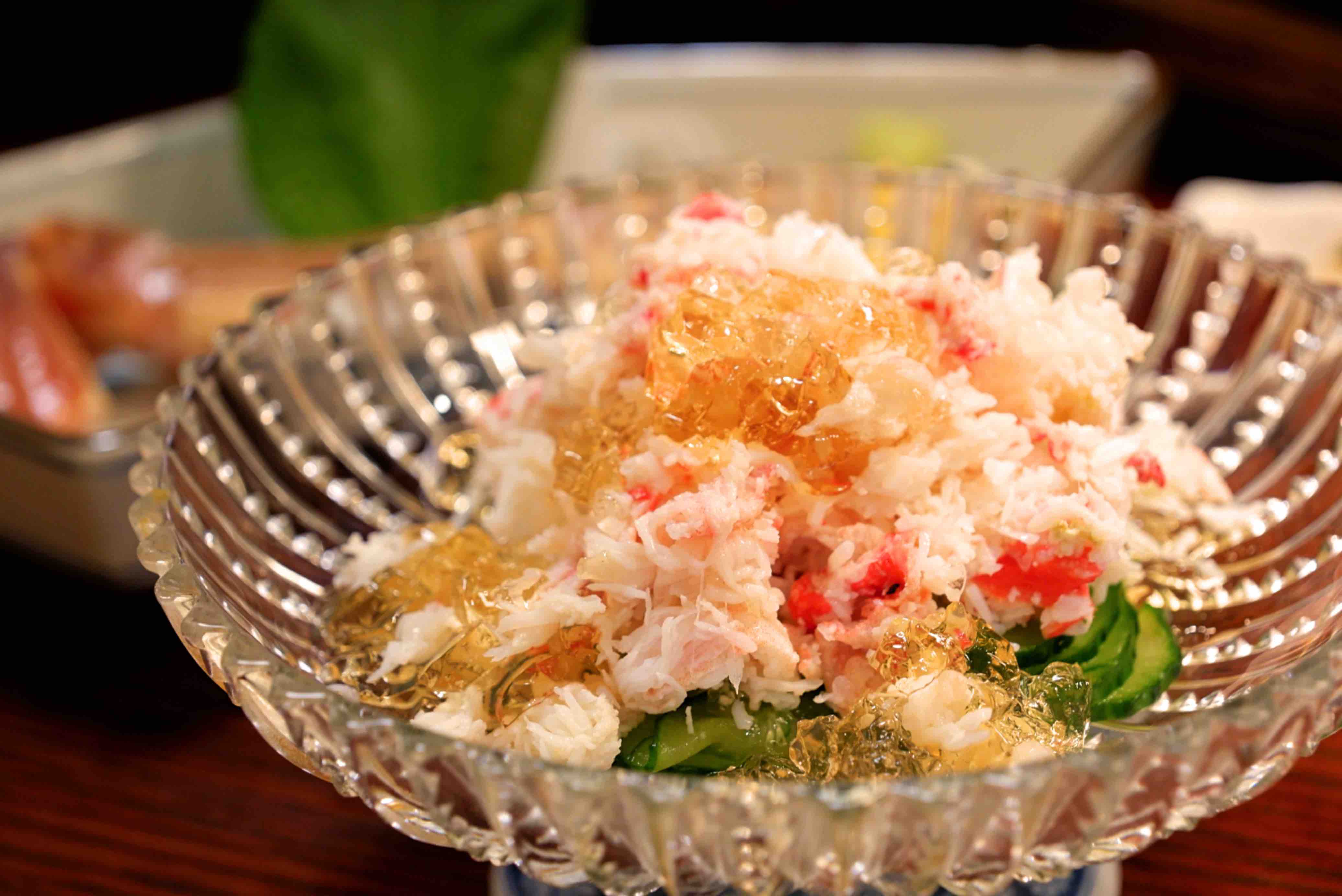 かにのほぐし身ときゅうりに かに酢ジュレをかけた一品