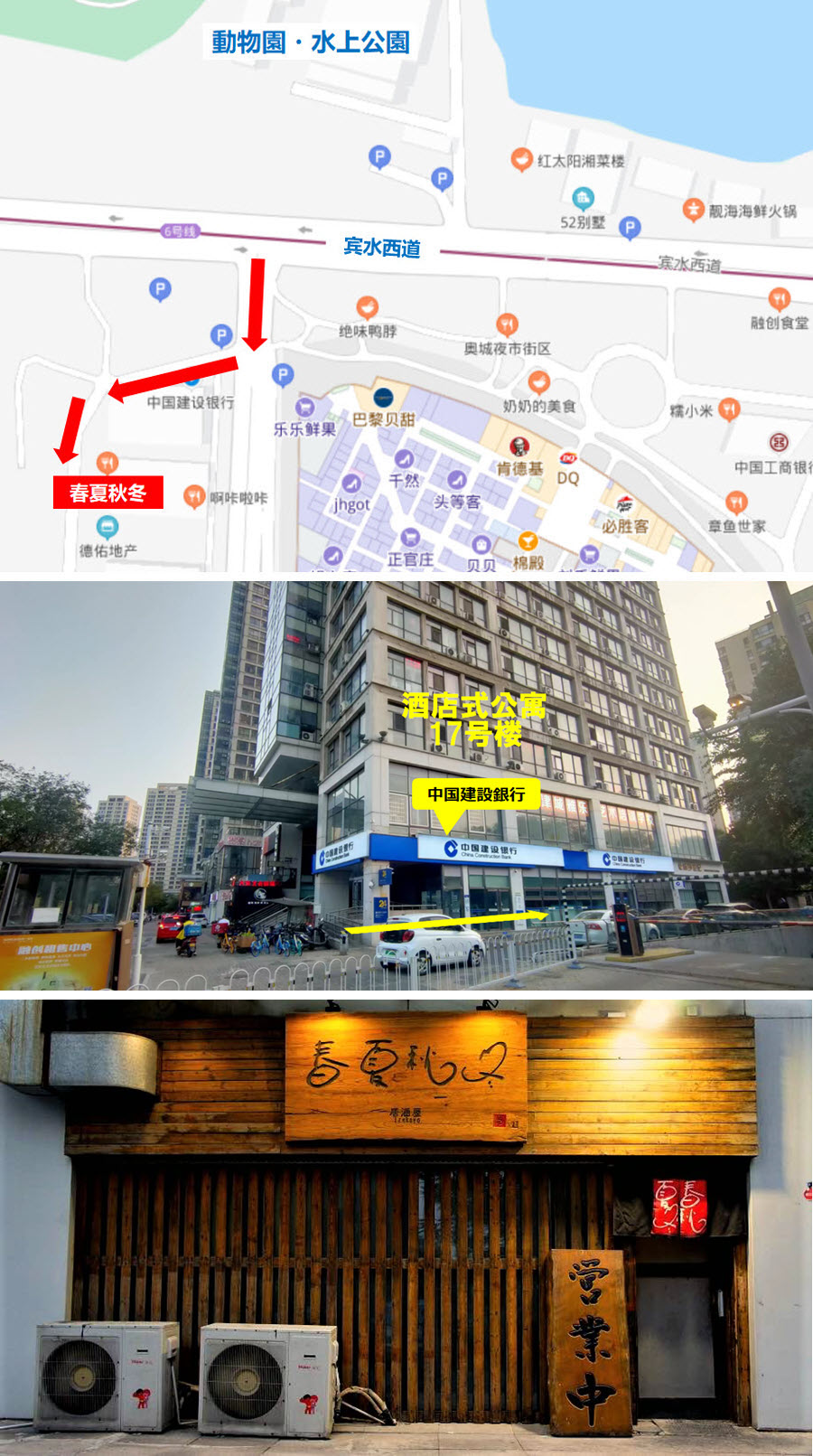 宾水西道から時代奥城商業広場に入ると右手一番手前が17号楼です。その1階の建設銀行のATMから右に曲がり、建物沿いに裏側に行ったところに「春夏秋冬」はあります。