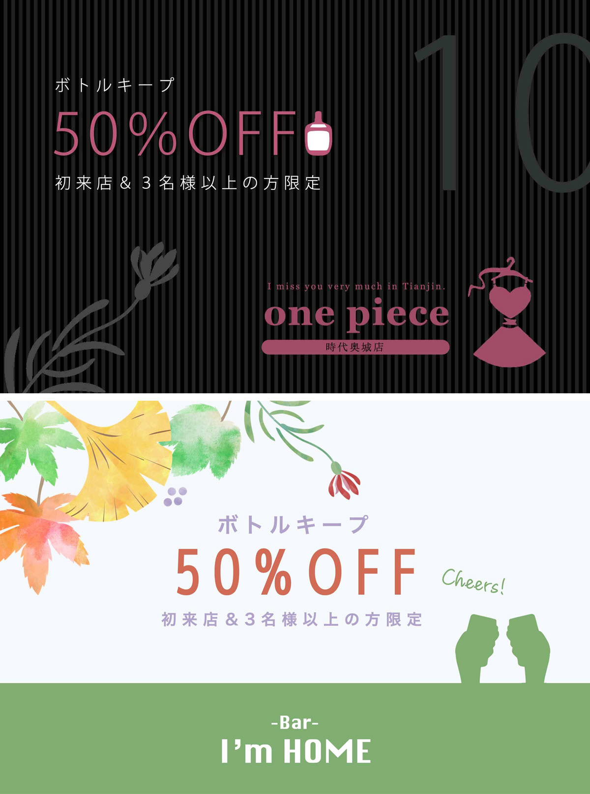 3名様以上で初めてご来店のお客様 | ボトルキープ50%OFF | | (1,000元以下のボトル) |