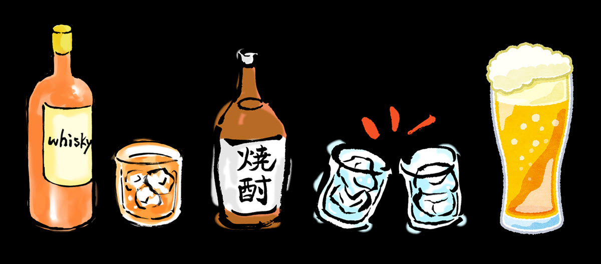お酒は ✔ ウイスキー ✔ 焼酎 ✔ ビール 銘柄はお店でご確認ください。