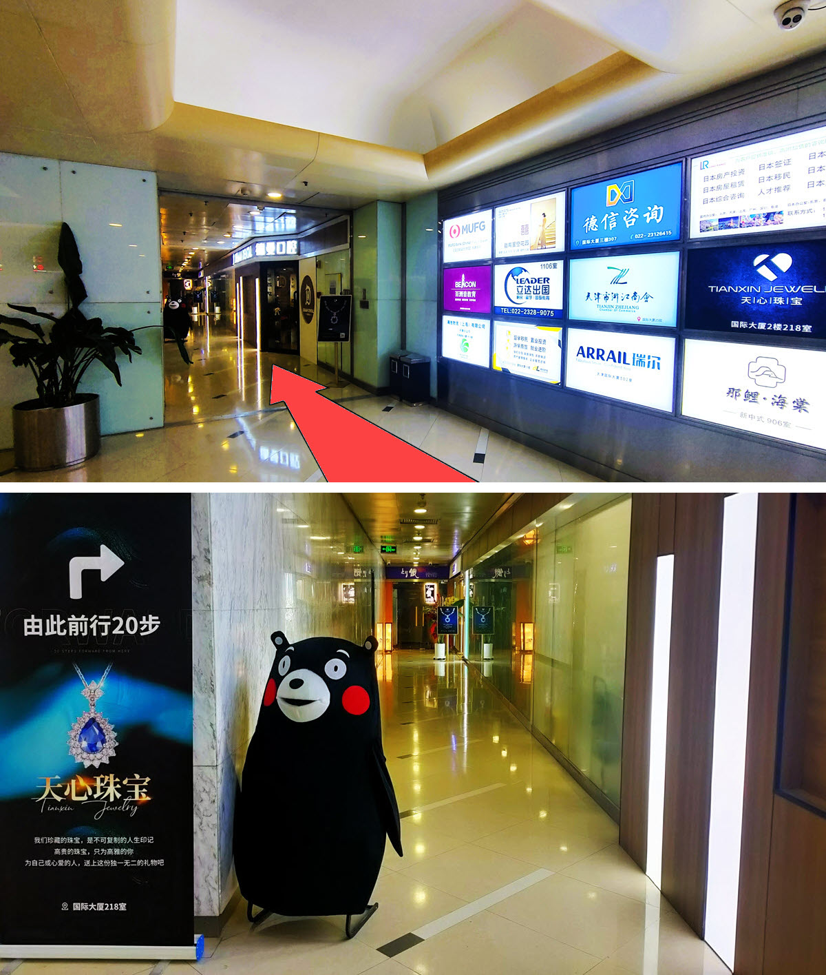 和平区南京路75号 天津国际大厦 2F 当店は国際ビルの2階にございます。 エスカレーターで2階へ上がり、矢印の方向に進んだ突き当りです。